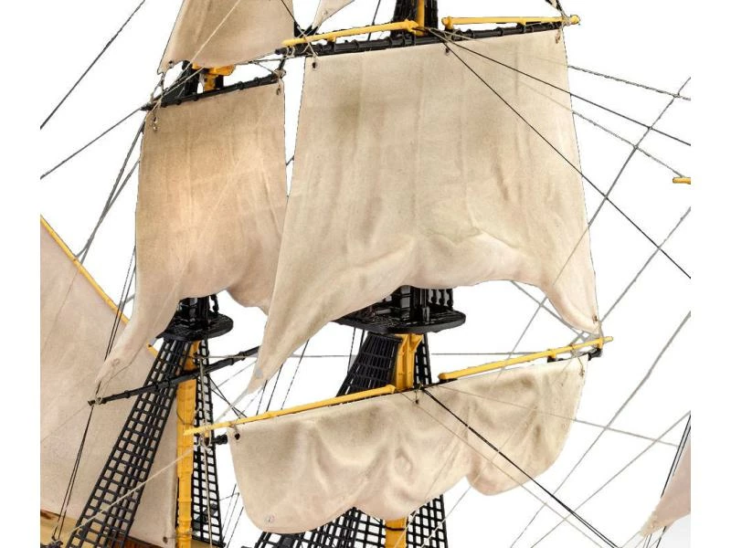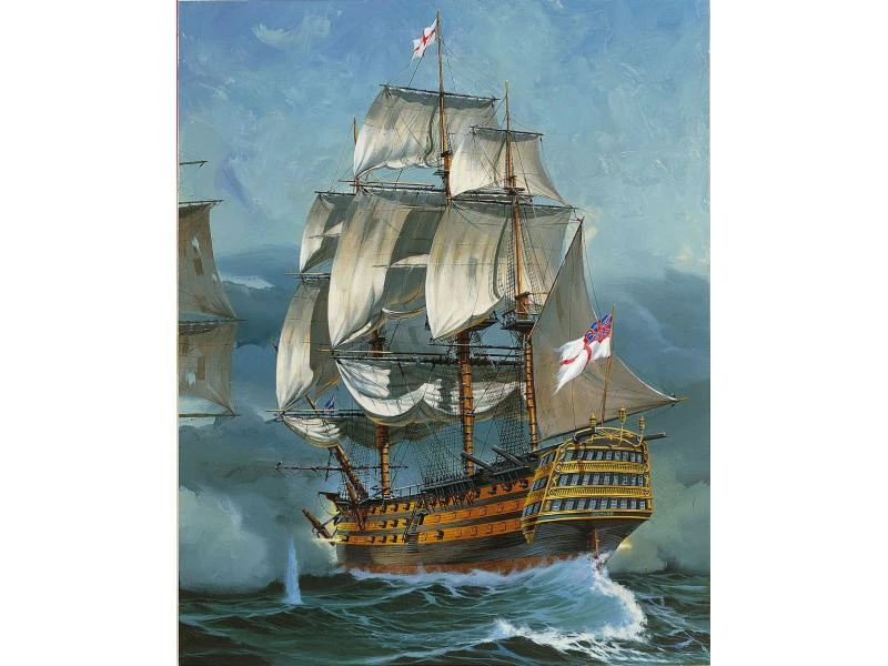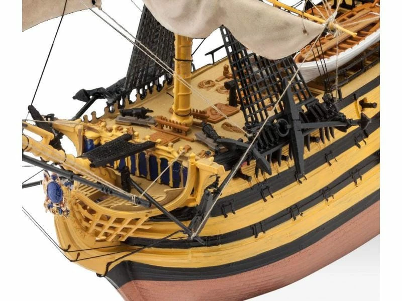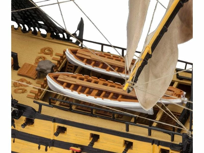 Gestalten Sie mit diesem Bausatz von Revell ein originalgetreues Modell des legendären britischen Segelschiffs H.M.S. Victory im Massstab 1:225. Die insgesamt 269 Bauteile des Sets sind unbemalt und wurden im Spritzgussverfahren aus Kunststoff gefertigt. Sie bestechen durch ihre hervorragende Detaillierung. So wurden die Rumpfwände und das strukturierte Deck authentisch nachgebildet. Der Bug ist mit Ornamenten dekoriert und auch die Mastkörbe fehlen nicht. Zur Fertigstellung des Modells benötigen Sie zusätzlich Kunststoffkleber sowie die entsprechenden Farben. Eine leicht verständliche Anleitung unterstützt Sie beim Zusammenbau und der Farbgestaltung.
