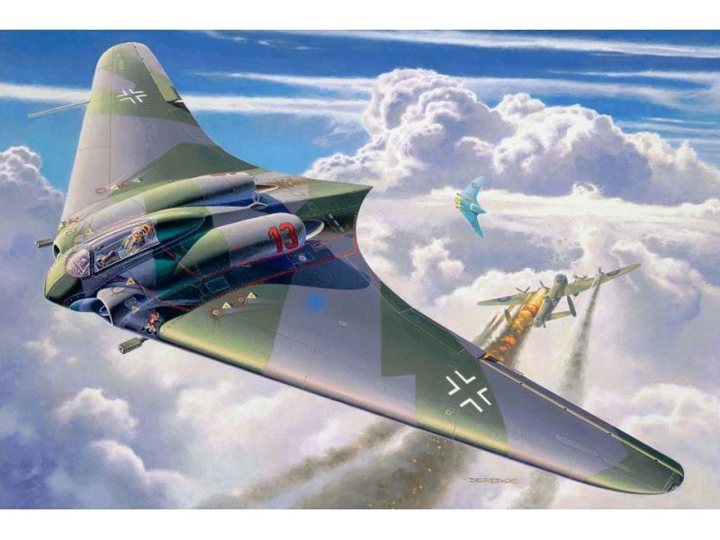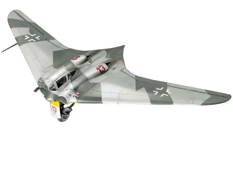 Bei dem Horten Go-229 handelt es sich um ein Nurflügel-Flugzeug, das zu Zeiten des Zweiten Weltkriegs in Deutschland entwickelt wurde. Der Modellnachbau veranschaulicht nicht nur den eigenwilligen Aufbau, sondern auch die optischen Einzelheiten des Kampffliegers. Die Oberflächenstrukturen sind dem Original nachempfunden und zeigen auch die versenkten Blechstösse. Das Fahrwerk des Modells kann von Ihnen wahlweise ein- oder ausgefahren aufgebaut werden. Sowohl das Front- als auch das Hauptfahrwerk sind sehr detailliert ausgearbeitet.