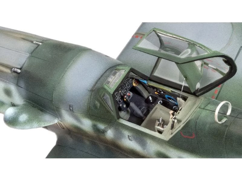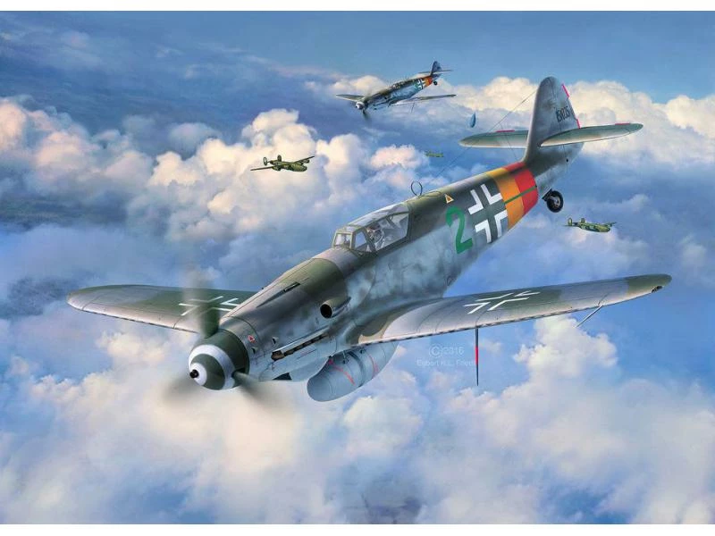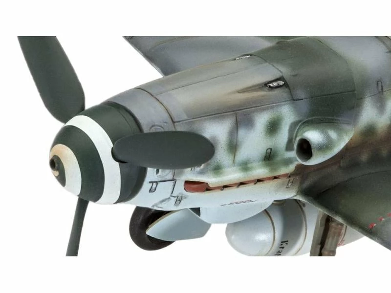 Bei der Messerschmitt Bf109 G-10 handelt es sich um das am meisten produzierte Fluggerät der deutschen Wehrmacht im Rahmen des Zweiten Weltkriegs. Der Antrieb der Propellermaschine wird auch im Modell detailreich dargestellt. Der Propeller ist am Bug des Flugzeugs montiert, wie beim Vorbild mit drei Rotorblättern versehen und kann auch nach Montage gedreht werden. Das Fahrwerk samt Reifen ist ebenfalls nachgebildet worden.