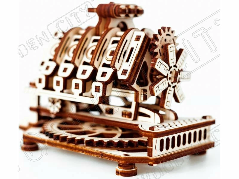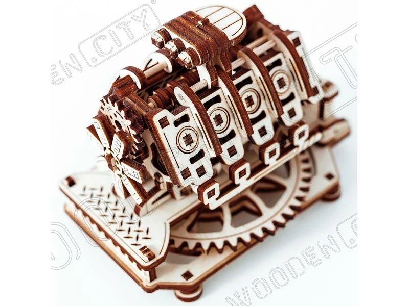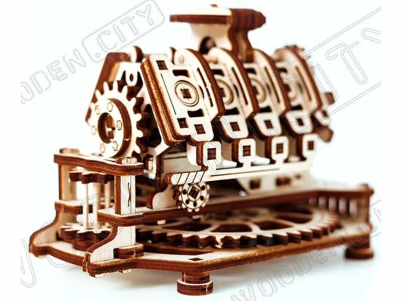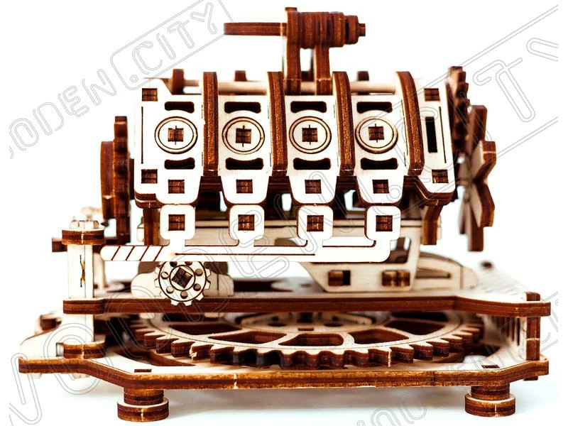 - V-förmiger Verbrennungsmotor, wird über ein horizontal drehendes Zahnrad in Bewegung gesetzt